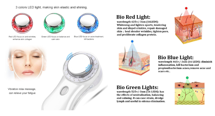 Blue light: acne curing, anti acne, inflammation diminishing, reduce acne scar, oil controlled, improve sensitive skin and skin rashes.